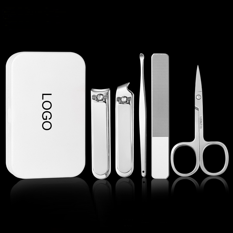 The nail art tools in this set are made of stainless steel. The kit includes a straight-edge nail clipper, slant-edge nail scissors, a nail file, an earwax scoop, and scissors. Custom logo is available.